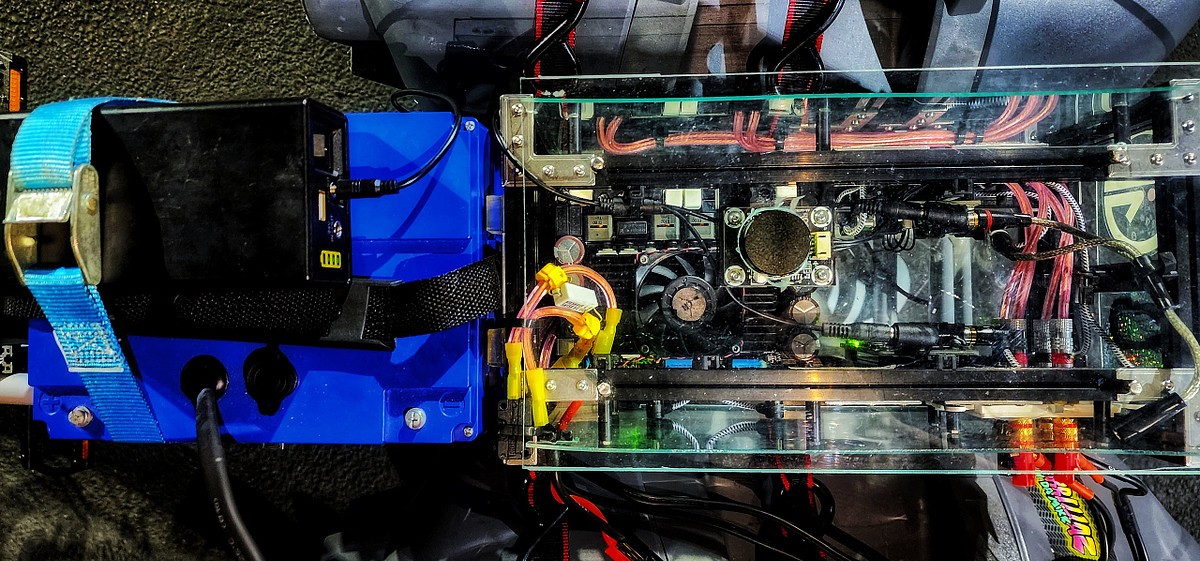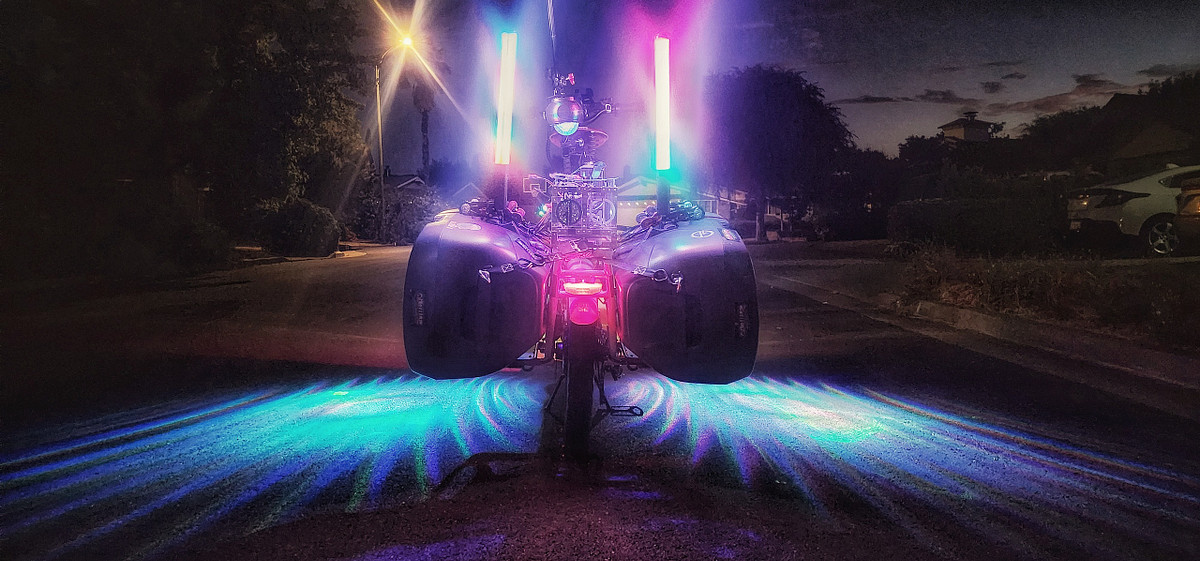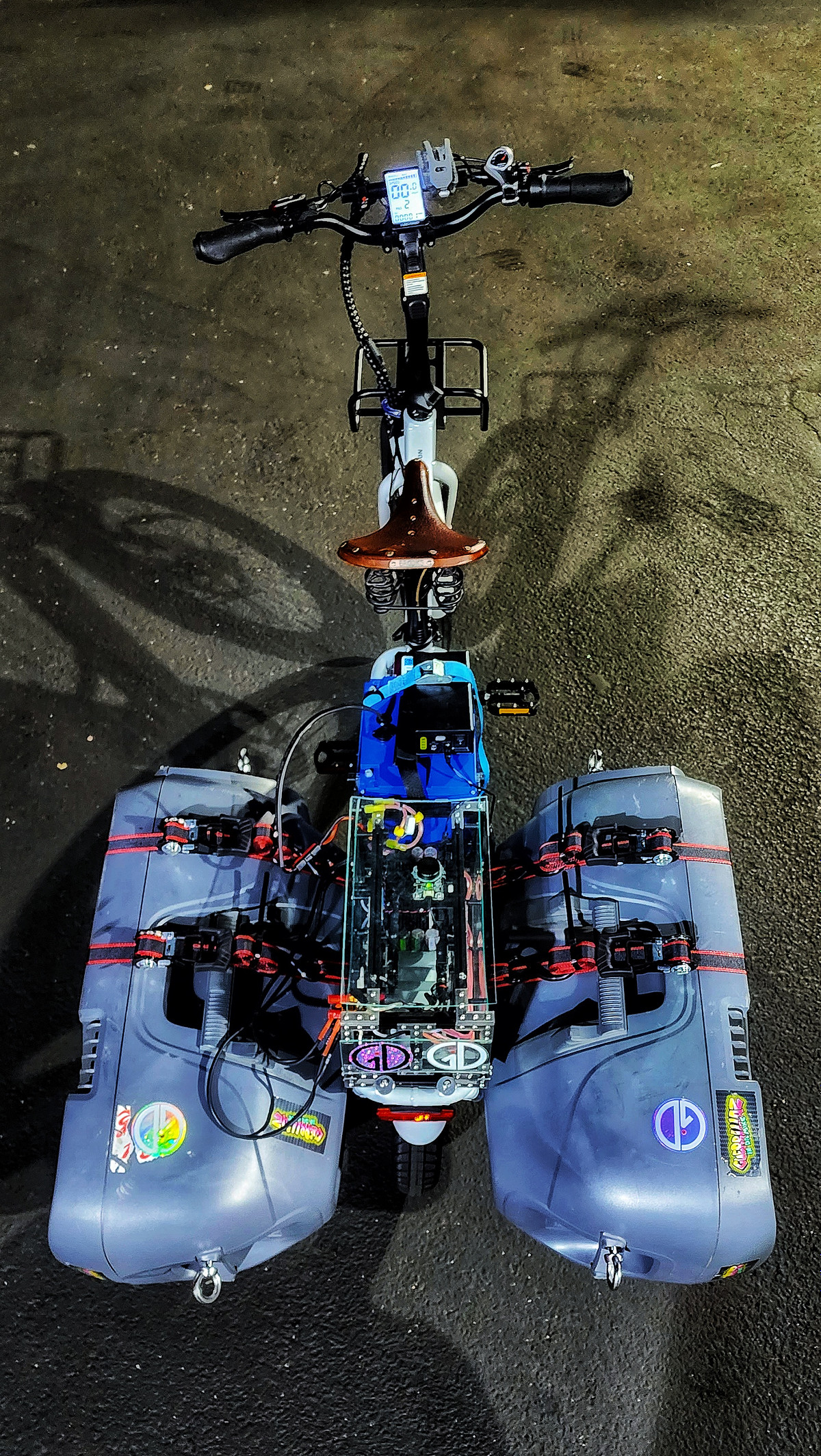 Powered by a custom 500 watt stereo amp with a D-Class designed core and encased in MakerBeam XL extrusion, Ghost of Blue Baboom certainly hits above the standard SPL of a sound bike. Featuring dual 15in JBL EONs, GoBB can literally blow your eardrums out.